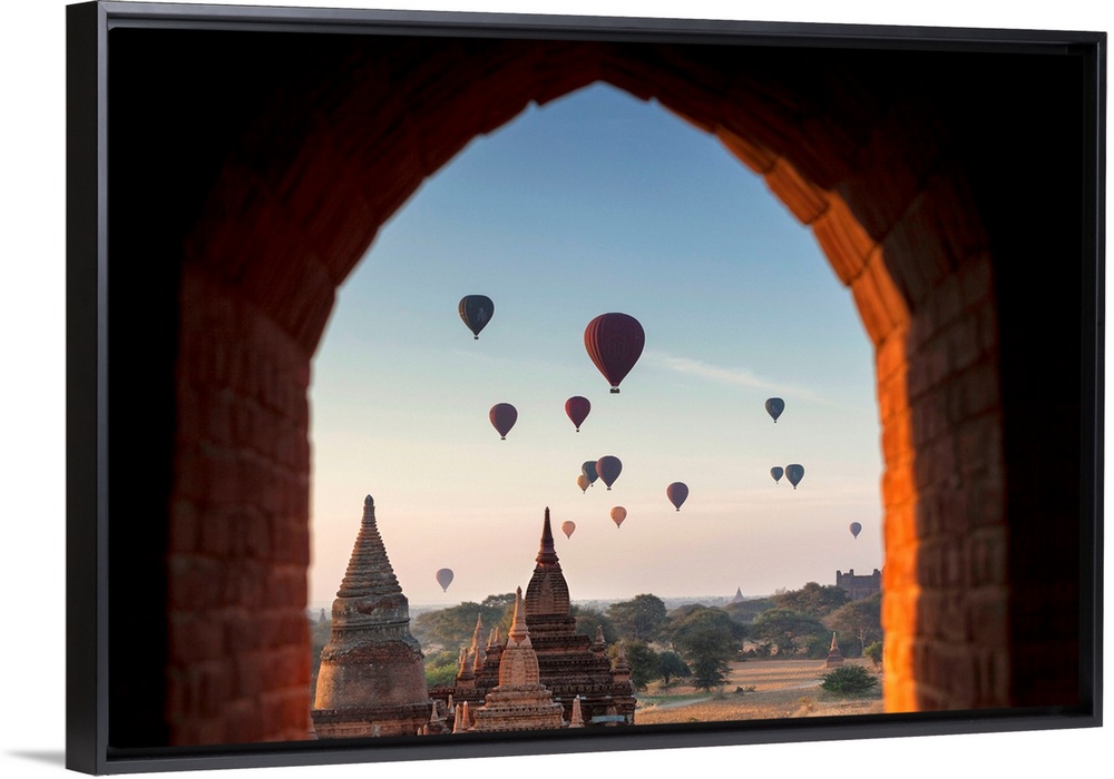 <p>Myanmar, Mandalay, Bagan at dawn, Buddhist Temple, Stupas with desert land sky full of hot-air balloons.</p>