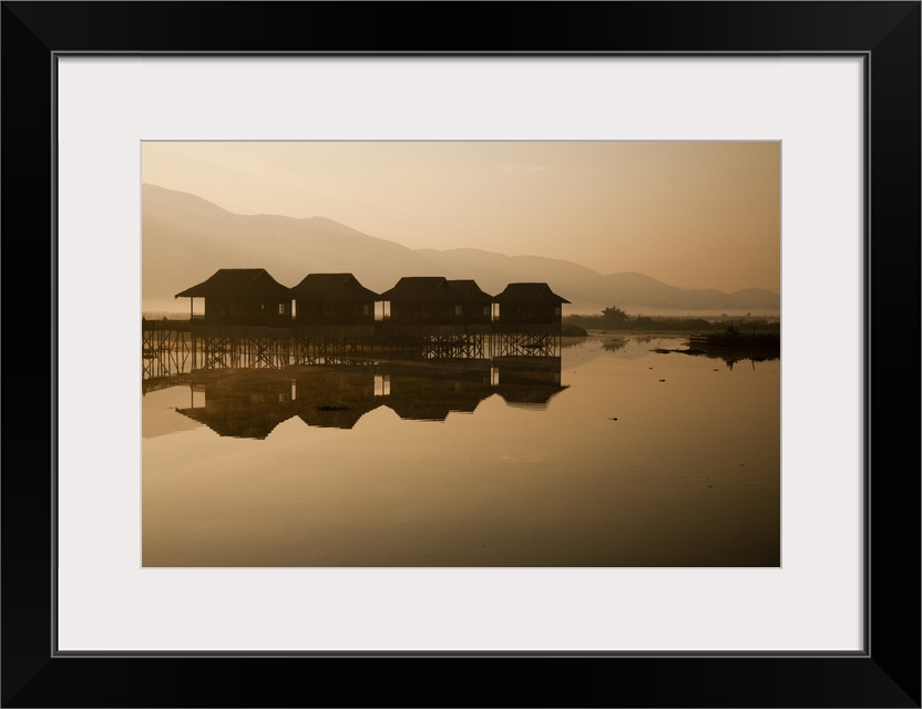 <p>Myanmar, Inle Lake. A misty dawn at Golden Island Cottages, a resort for tourists owned by the Pa-O people, a collection of comfortable wooden huts on stilts, Inle Lake.</p>