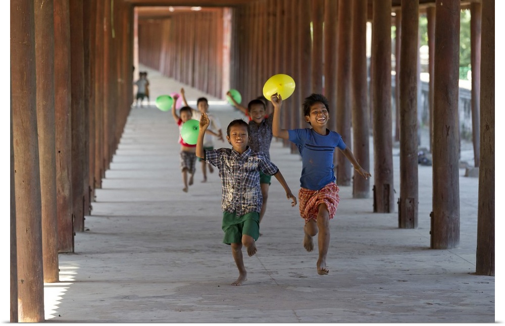 <p>Myanmar, Mandalay, Bagan, Local children running along a passage with balloons.</p>