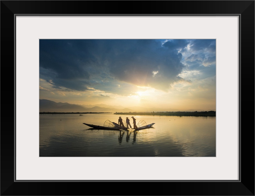 <p>Myanmar, Shan, Nyaungshwe, Inle Lake, Taunggyi district, Three local fishermen in silhouette at sunrise</p>