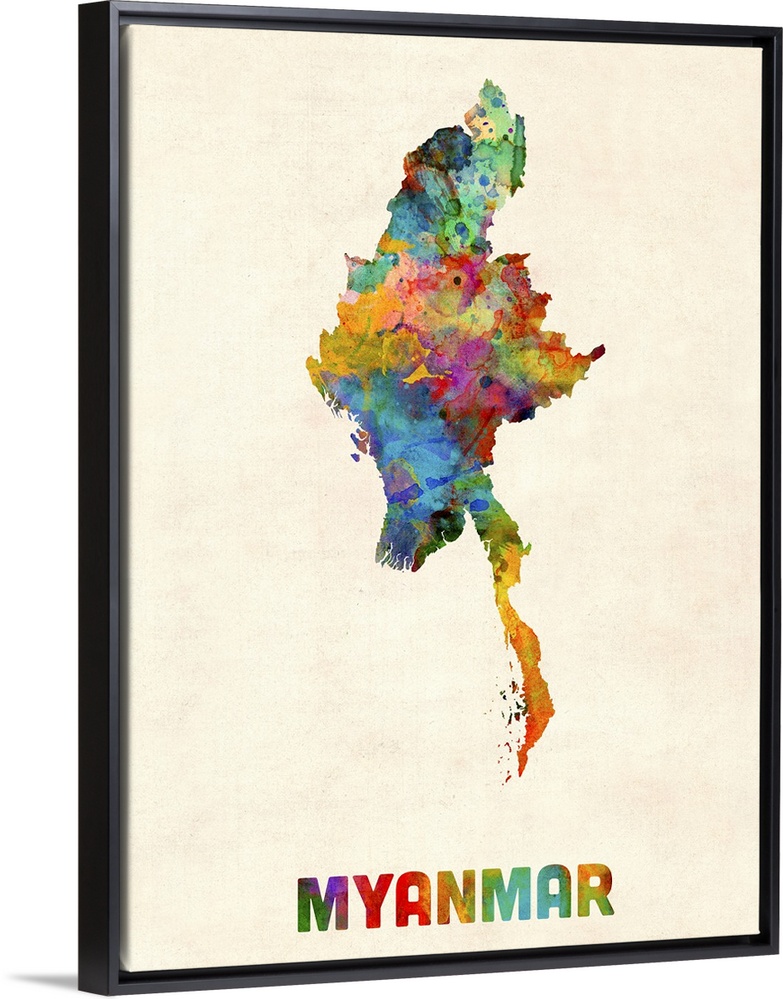 <p>Colorful watercolor art map of Myanmar against a distressed background.</p>
