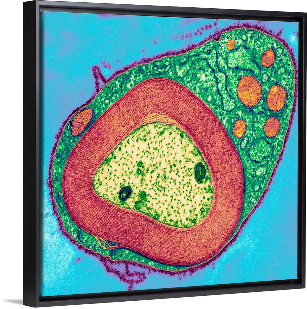 <p>Myelinated nerve. Coloured transmission electron micrograph (TEM) of myelinated nerve fibres and Schwann cells. Myelin (red) is an insulating fatty layer that surrounds nerve fibres (axons, yellow), increasing the speed at which nerve impulses travel. It is formed when Schwann cells wrap around the fibre, depositing layers of myelin between each coil. The outermost layer consists of the Schwann cell's cytoplasm (green) and is known as the neurolemma or sheath of Schwann. Mitochondria (orange) supply the cells with energy.</p>