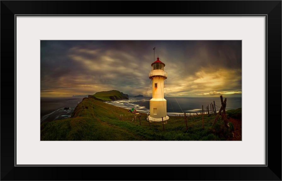 <p>Mykinesholmur lighthouse and mykines island at sunset, faroe islands, denmark.</p>