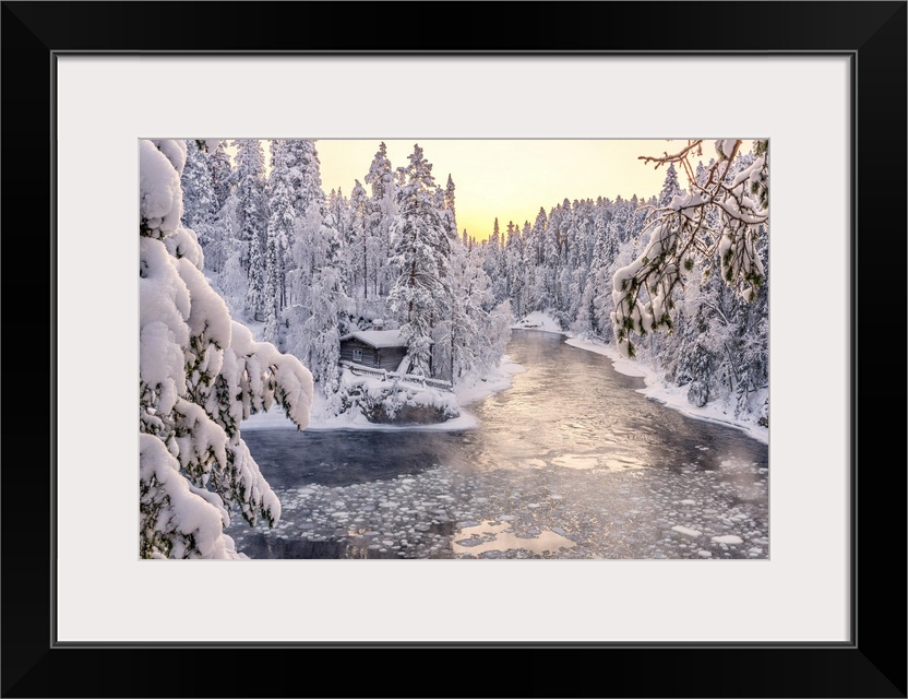 <p>Myllykoski frozen rapids and snowy mill into an arctic forest at sunrise, Juuma, Oulanka National Park, Kuusamo, Lapland, Finland</p>