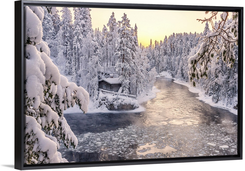 <p>Myllykoski frozen rapids and snowy mill into an arctic forest at sunrise, Juuma, Oulanka National Park, Kuusamo, Lapland, Finland</p>