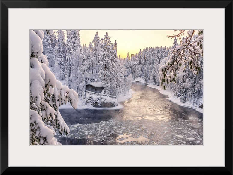 <p>Myllykoski frozen rapids and snowy mill into an arctic forest at sunrise, Juuma, Oulanka National Park, Kuusamo, Lapland, Finland</p>