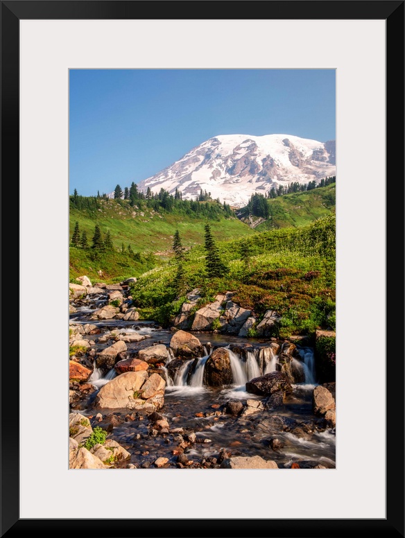 <p>View of a tranquil waterfall with Mount Rainier peak in the background, Mount Rainier National Park, Washington.</p>