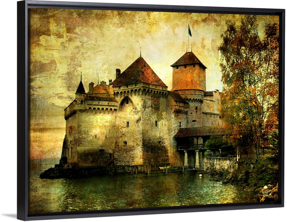 <p>mysterious castle on the lake - artwork in painting style</p>