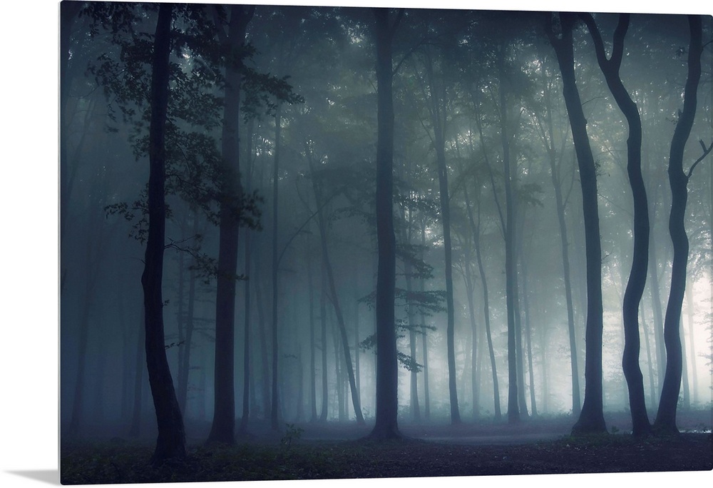 <p>A dramatic photograph of a silhouetted forest covered in fog.</p>