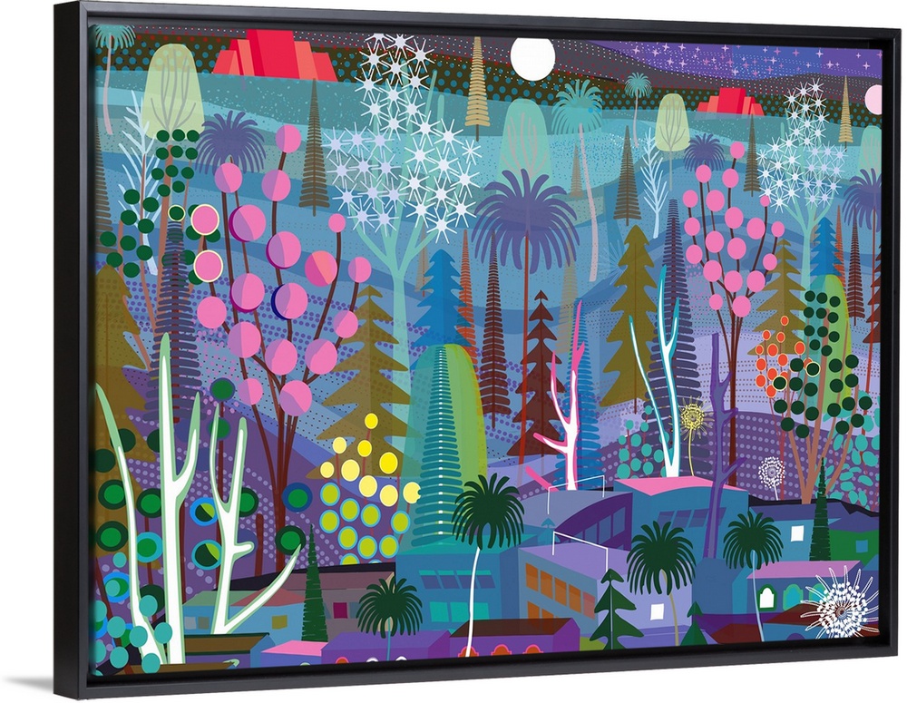 <p>Forest and town at night with red pyramids in distanceIllustration and painting</p>