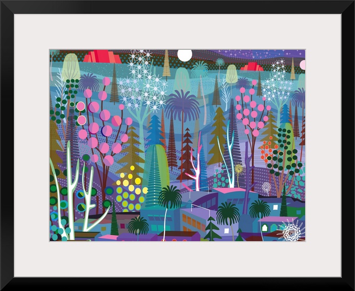 <p>Forest and town at night with red pyramids in distanceIllustration and painting</p>