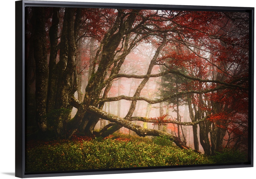 <p>Mossy branches criss-crossing in a foggy forest with red leaves.</p>