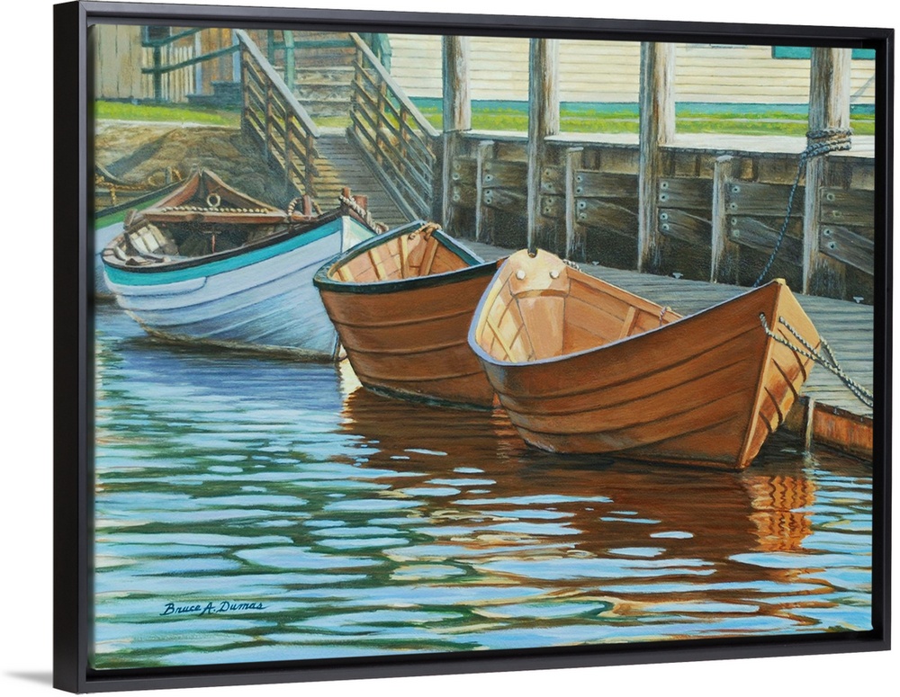 <p>Contemporary artwork of rowboats at a dock.</p>
