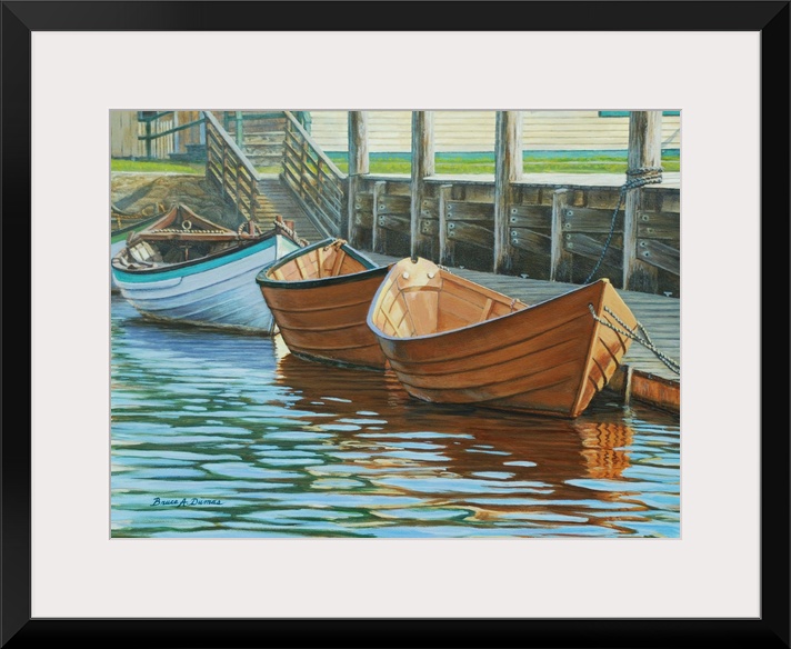 <p>Contemporary artwork of rowboats at a dock.</p>