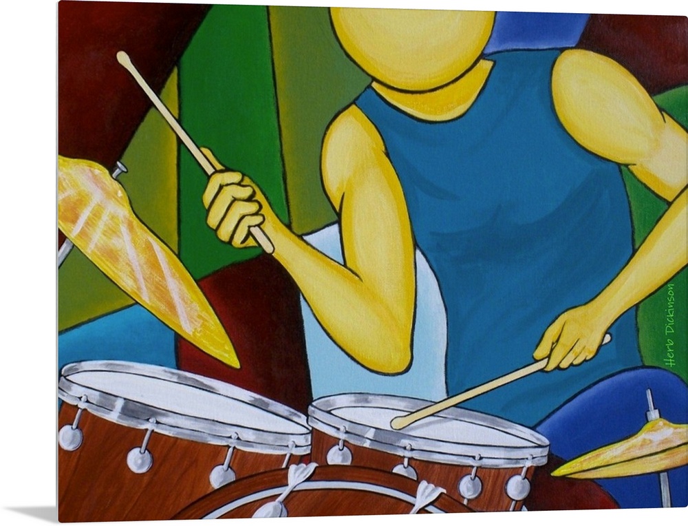 <p>Abstract painting of a faceless person playing the drums.</p>