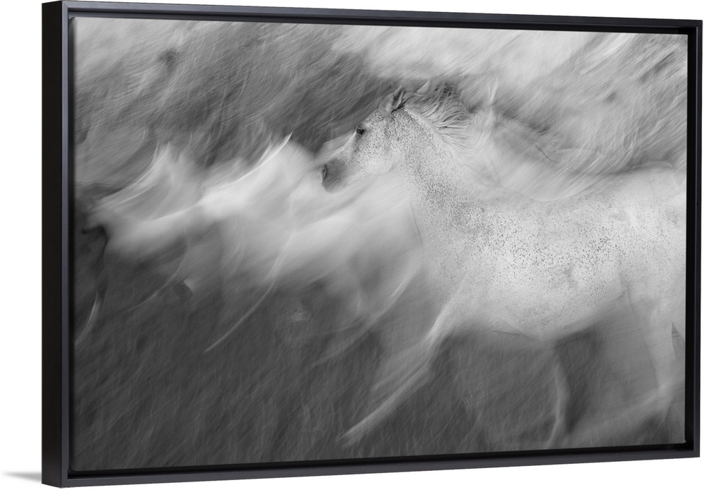 <p>Blurred motion image of a herd of white horses galloping in a field.</p>