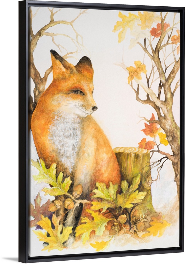 <p>Watercolor painting of a fox with fall leaves next to a stump.</p>