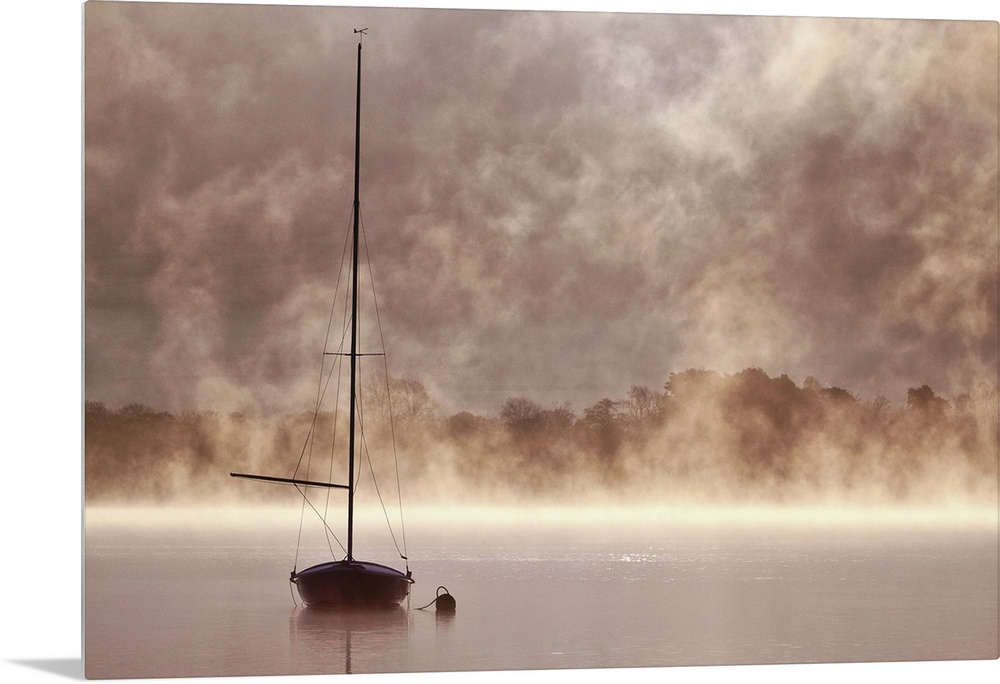 <p>A boat with a tall mast in a misty lake in Cumbria.</p>