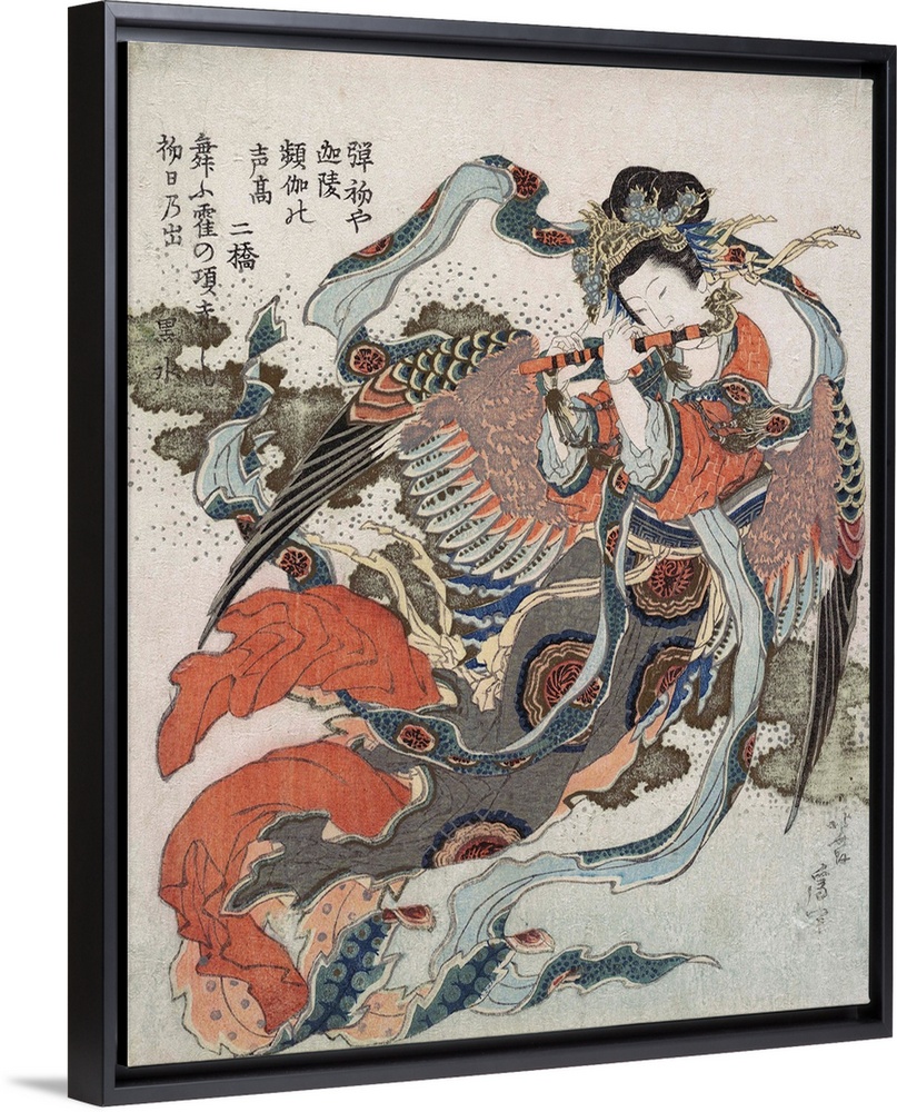 <p>This surimono New Year's card depicts a mystical Buddhist bird (karyobinga in Japanese; kalavinca in Sanskrit) characterized by a bird's body and a human head. It is said that one can never tire of listening to the creature's heavenly music. The New Year's poems were inscribed by Nikyo and Kokusui. Hokusai's signature reads Hokusai aratame Iitsu (Hokusai changed to Iitsu). The work is from the artist's very productive Iitsu period (ca. 1820-33).</p>