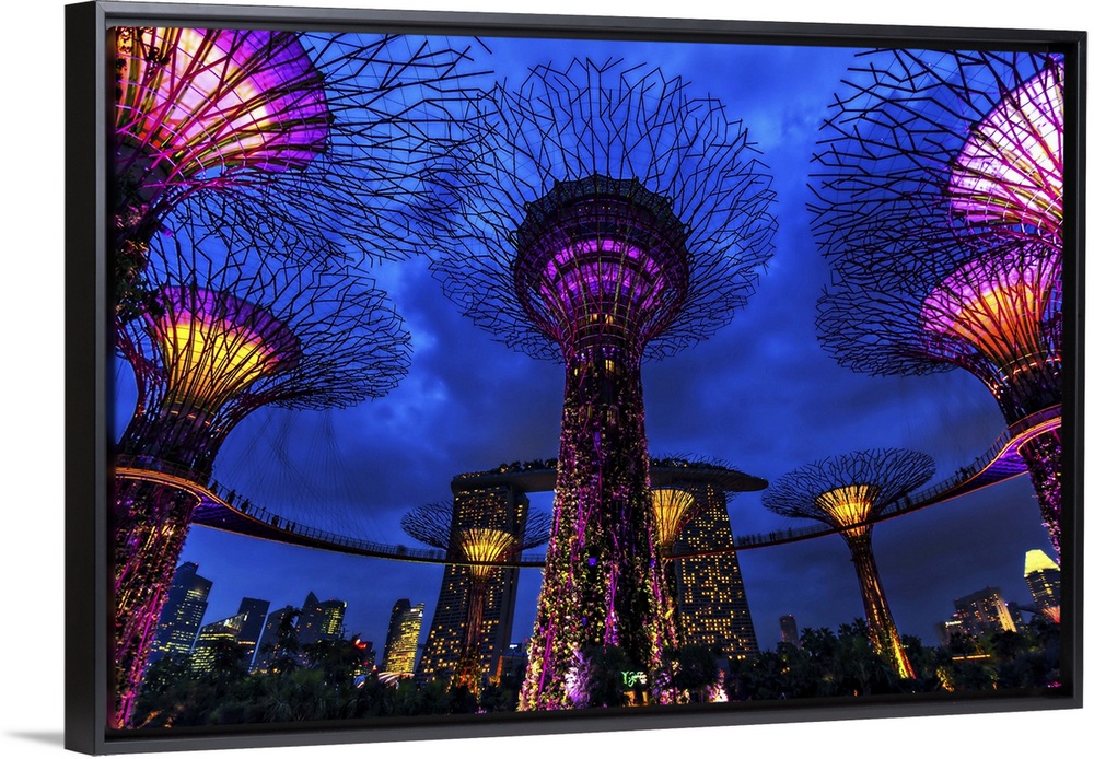 <p>Photograph looking up at neon lit tree structures in Singapore.</p>