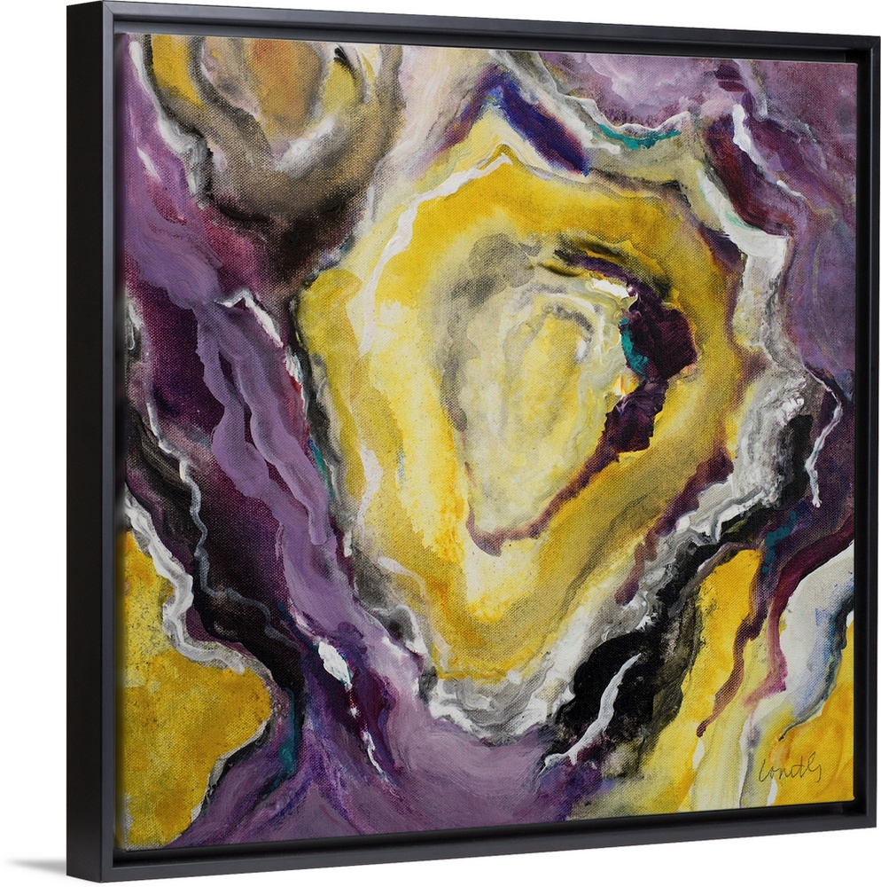 <p>Square abstract painting of quartz showing the purple, gold, white, and black agate.</p>
