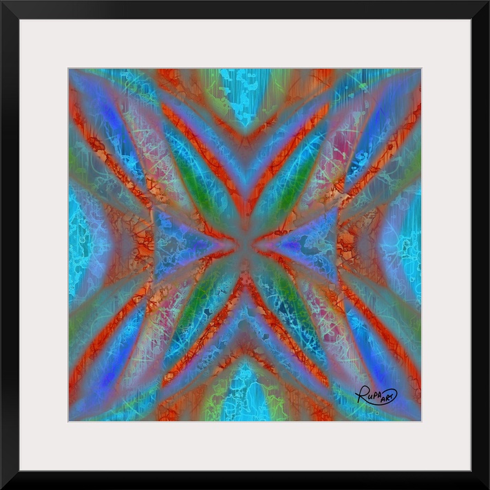 <p>Digital contemporary art of a kaleidoscopic pattern of neon red, blue, and orange colors.</p>