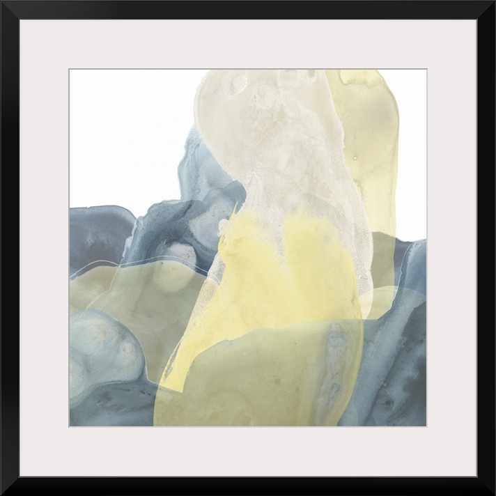 <p>Yellow, blue and beige pools of color overlap each other against a white background in this abstract artwork.</p>