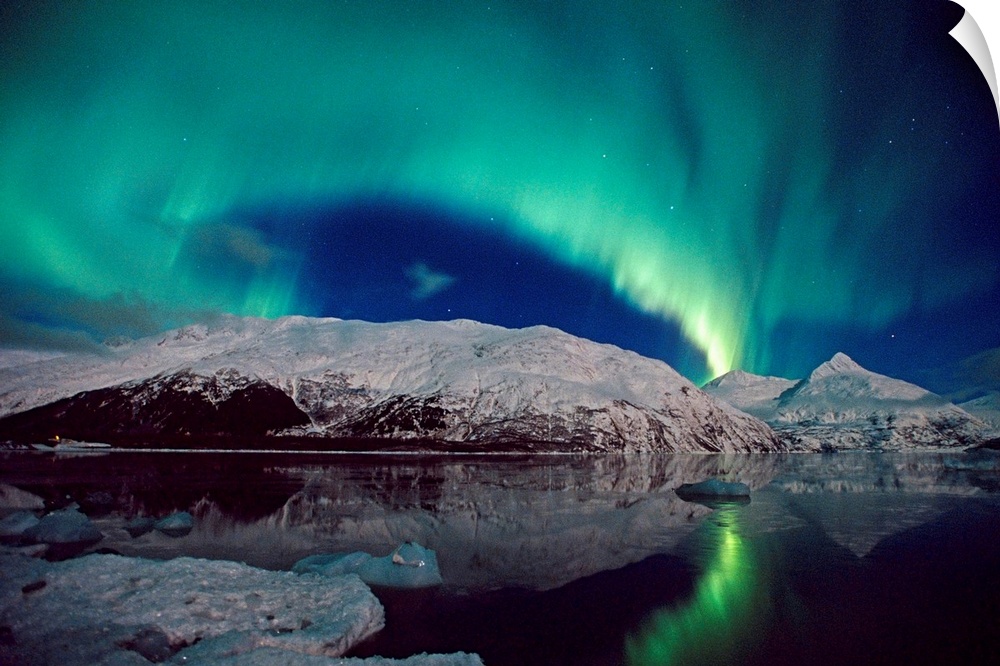 <p>Canvas photo art of northern lights in the sky above snow covered mountains near water.</p>