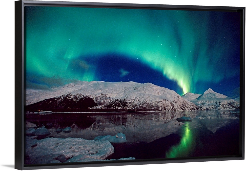 <p>Canvas photo art of northern lights in the sky above snow covered mountains near water.</p>