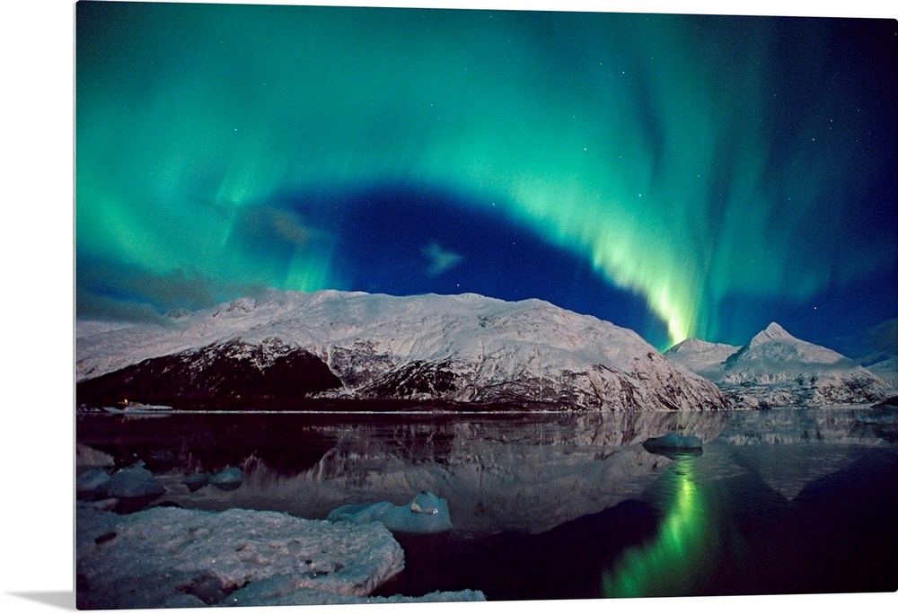 <p>Canvas photo art of northern lights in the sky above snow covered mountains near water.</p>
