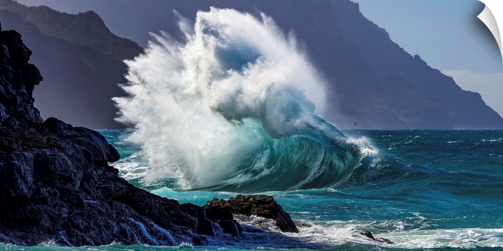 <p>Large ocean wave crashes into rock along the Na Pali Coast; Kauai, Hawaii, United States of America</p>