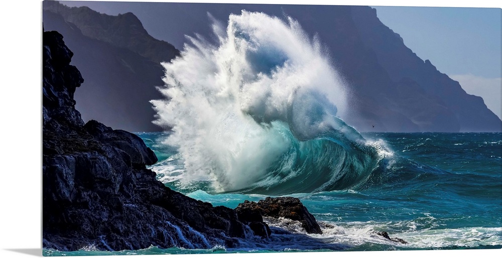 <p>Large ocean wave crashes into rock along the Na Pali Coast; Kauai, Hawaii, United States of America</p>