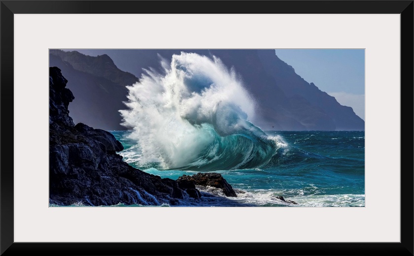 <p>Large ocean wave crashes into rock along the Na Pali Coast; Kauai, Hawaii, United States of America</p>
