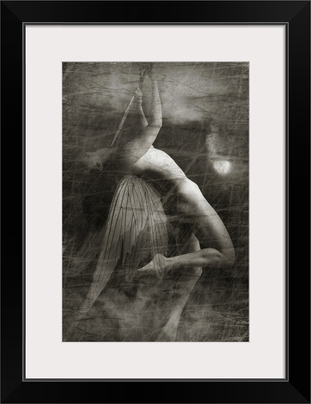 <p>Naked female angel with wings leaning back with sword pointing at throat</p>