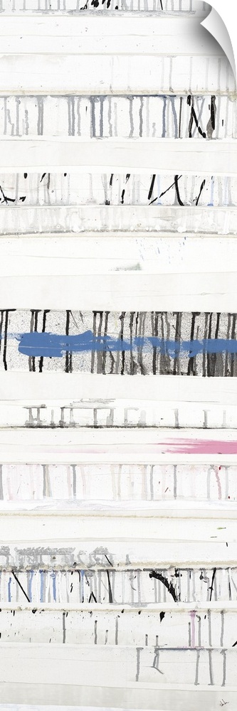 <p>A long vertical painting of horizontal lines with dripped paint textures and subtle colors.</p>