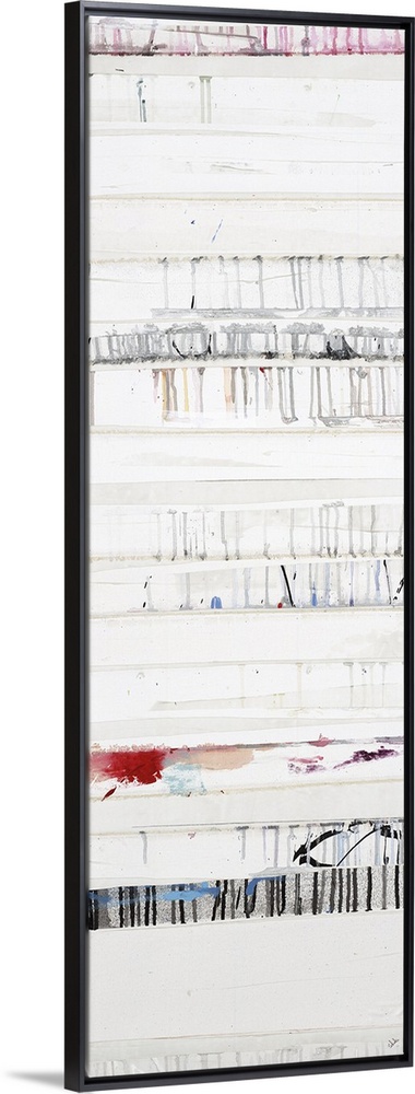<p>A long vertical painting of horizontal lines with dripped paint textures and subtle colors.</p>