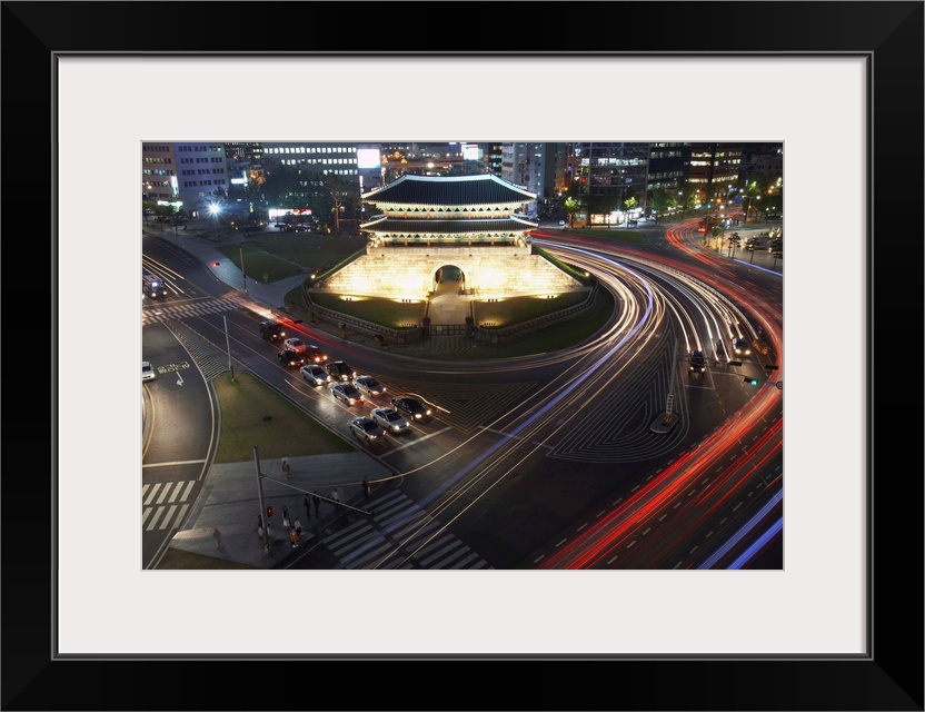 <p>Traffic circles Namdaemun Gate (or Great South Gate) in Seoul at night.</p>