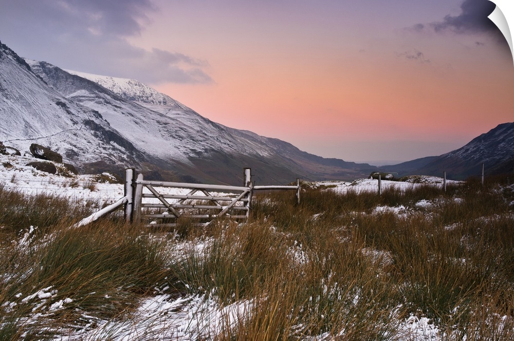 <p>Nant Ffrancon valley towards coast from Ogwen Cottage in Snowdonia on winter morning.</p>