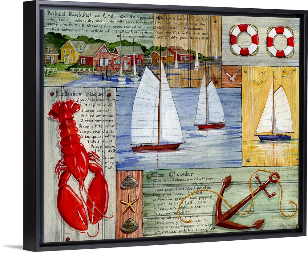 <p>Collection of nautical elements from Nantucket, including a lobster, anchor, sailboats, and lifesavers.</p>