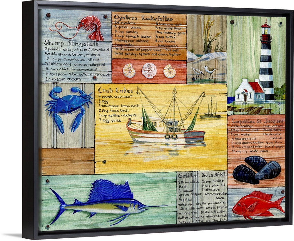 <p>Collection of nautical elements from Nantucket, including a sailfish, lighthouse, and fishing boat.</p>
