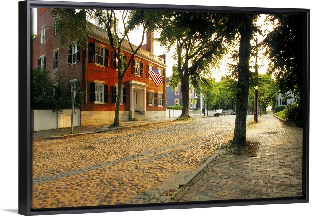 <p>A large house on a cobble street in Massachusetts is photographed as the sun begins to set and shines on part of the home.</p>