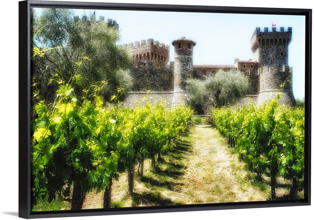 <p>Low Amgle View of a Tuscan Style Castle with rows of Grapevine, California</p>