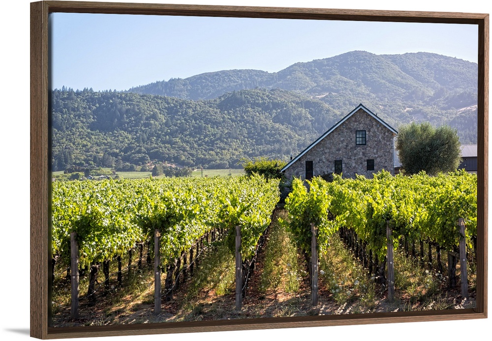 <p>Landscape photograph of a Napa Valley vineyard with rows of grape vines and a cobblestone building in the background with rolling mountains beyond.</p>