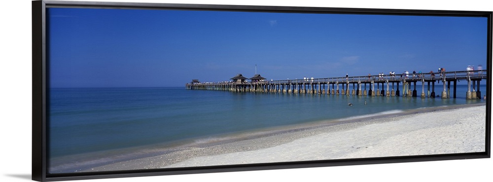<p>This wall art is a panoramic photograph of a beach board walk extending into the ocean.</p>