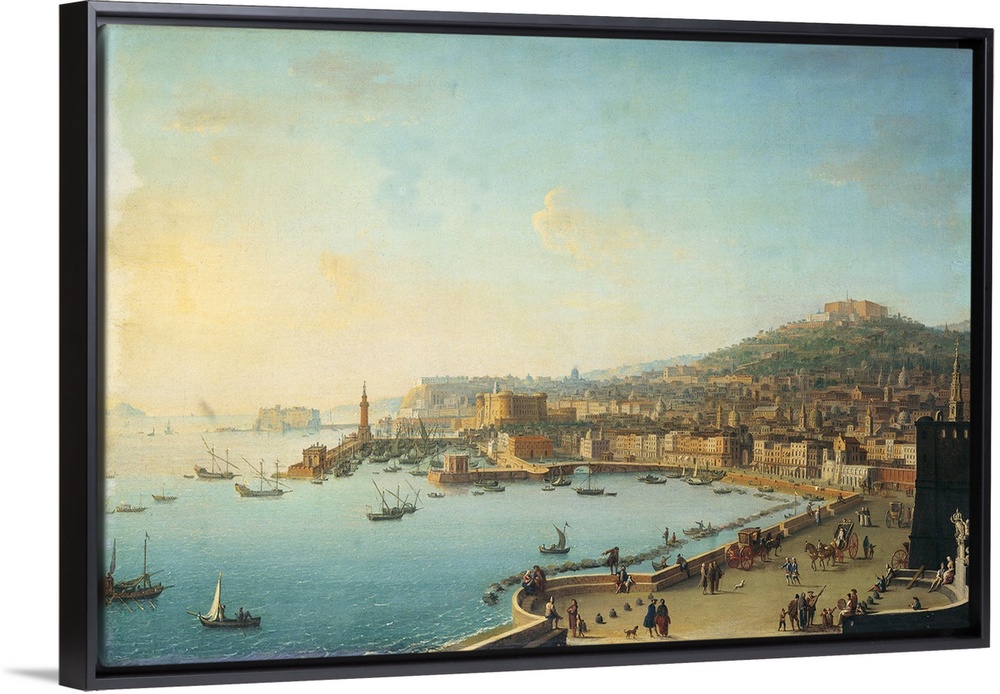 <p>Naples Seen form the Easter Coast (Napoli dalla zona orientale), by Antonio Joli, 18th Century, oil on canvas, Whole artwork view. View of the city of Naples, seen from the easter coast, of which can be seen the harbour crowded with boats; on the boardwalk crowd passersby and carriages; on the right, in the foreground, a semicircular edge with a small statue., Oil on canvas.</p>
