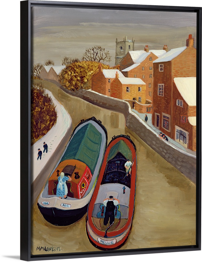 <p>Contemporary painting of two boats in a canal in the city.</p>
