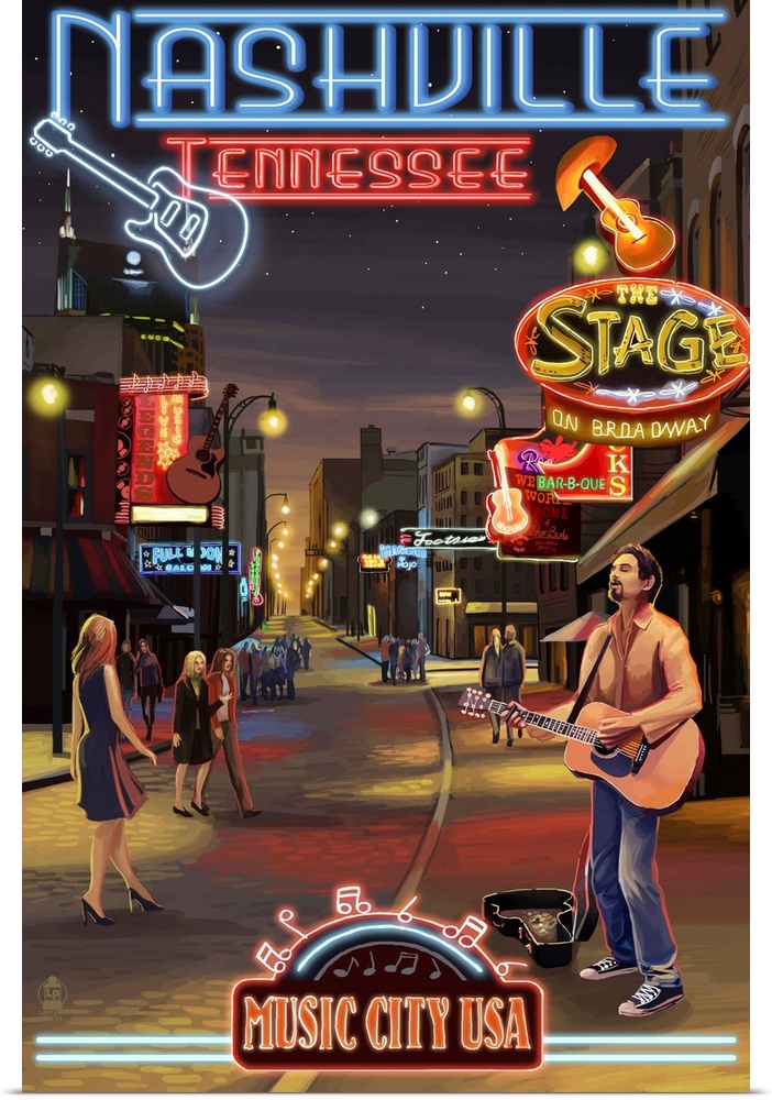 <p>Retro stylized art poster of neon signs and a man playing a guitar.</p>