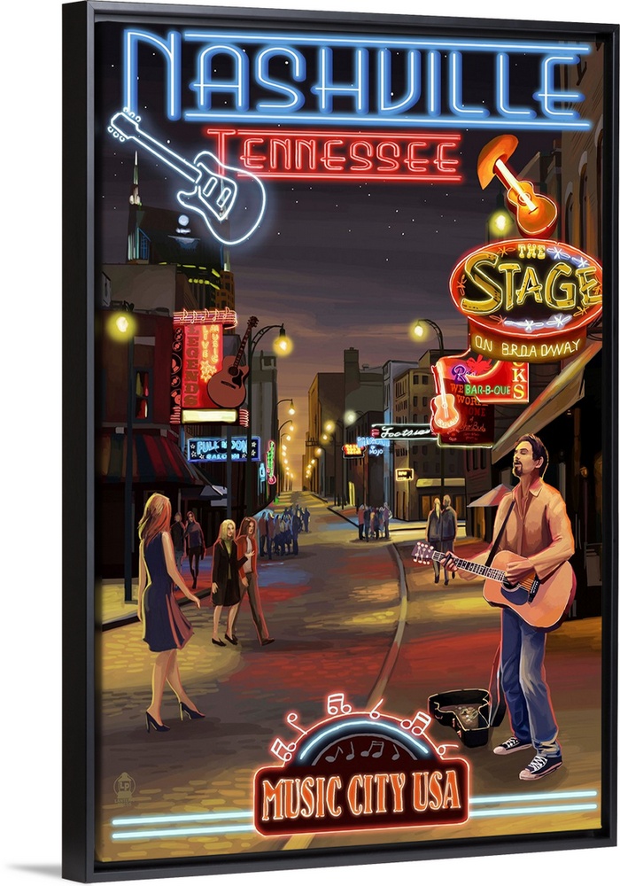 <p>Retro stylized art poster of neon signs and a man playing a guitar.</p>