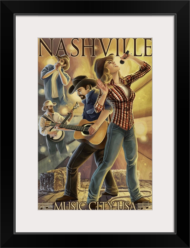 <p>Retro stylized art poster of a man playing a guitar and woman siging.</p>