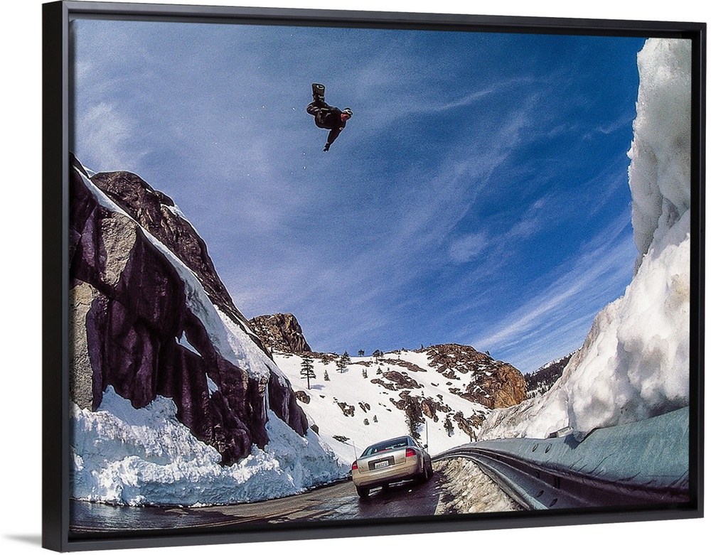 <p>Nate Mott flying on his snowboard over the Donner Summit, as a car passes by below, California, mid 90s.</p>
